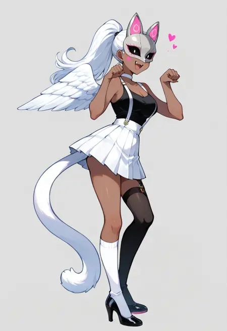 | トレーニングワード | white hair, ponytail, grey cat mask, dark-skinned femaleコピーしました! white collar, black strapless top, white pleated skirt, suspender skirt, bare shoulders, pink paint splatters on clothes, asymmetrical footwear, white sock, black stocking, black high heels, white cat tail, white wingsコピーしました! |