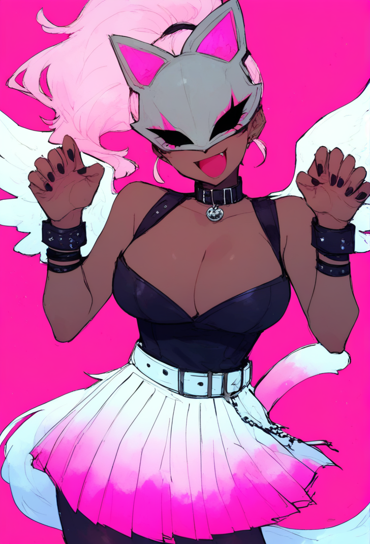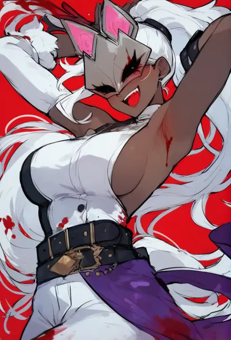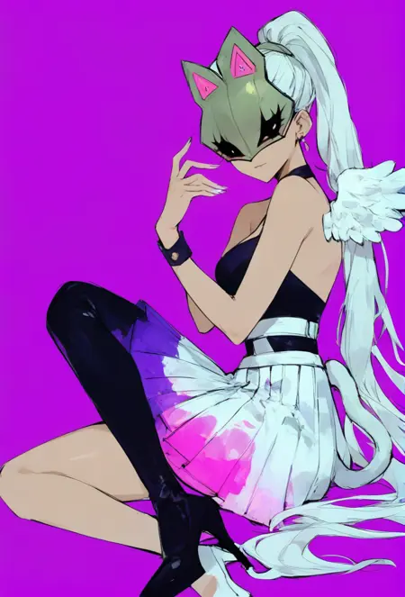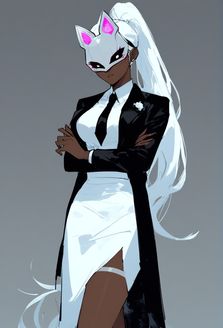 white hair, ponytail, mask, cat mask, dark-skinned female
