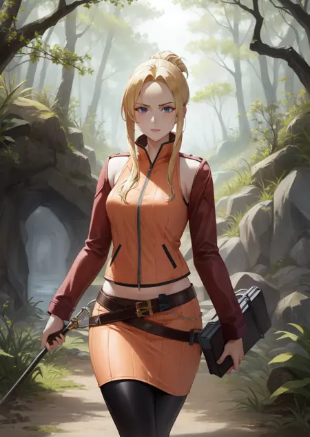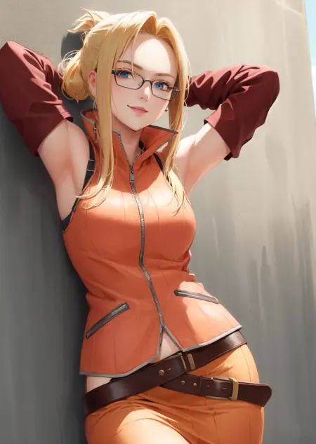 전형적인 모습을 위해 "오렌지 재킷, 탈착식 소매, 오렌지 스커트, 벨트, 레깅스, 부츠"를 추가하세요. "안경"은 선택 사항입니다.