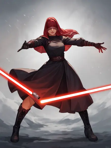 1girl, visasmarr, red veil, covered eyes,black robes, gloves, boots