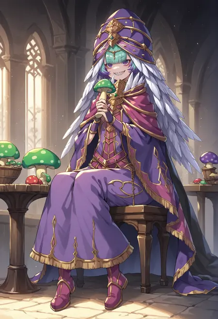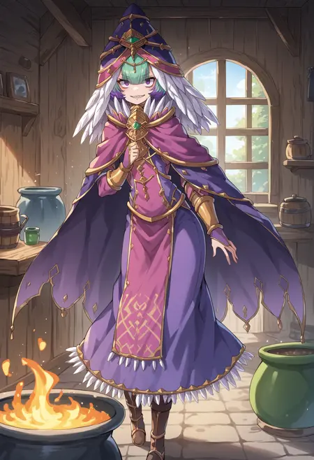 2段階覚醒:短髪、多色髪、緑髪、紫髪、紫目、鋭い歯、尖った帽子、フード、フードをかぶっている、マント、ロングスカート、羽根、ブーツ