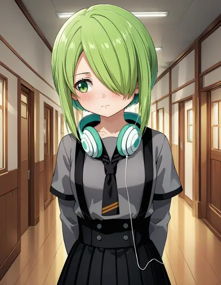 외모: 녹색 머리, 단발, 녹색 눈, 한쪽 눈 가려짐