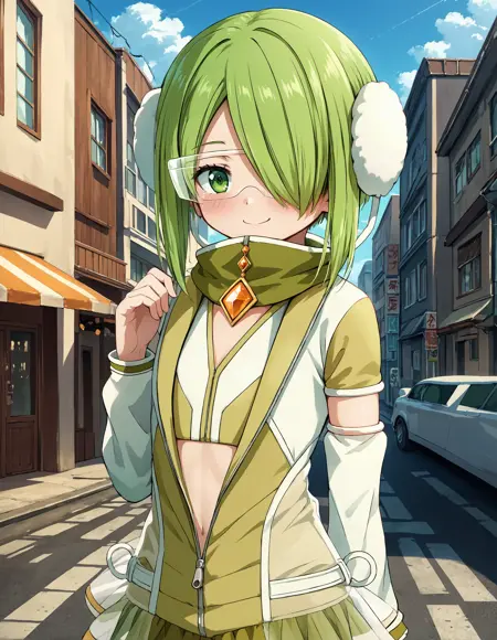 마법사 복장: mgrcshiguremiyabi, shgmgc, 고글, 흰색 귀 덮개, 녹색 높은 칼라, 주황색 보석, 흰색 상의, 녹색 부분 지퍼 풀린 재킷, 흰색 분리형 소매, 녹색 치마, 투명한 겉치마