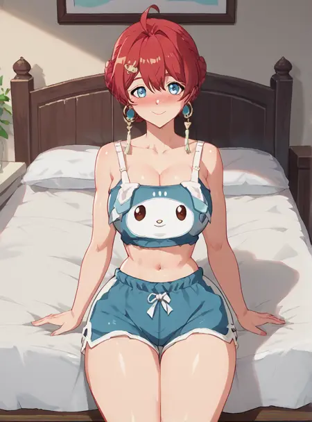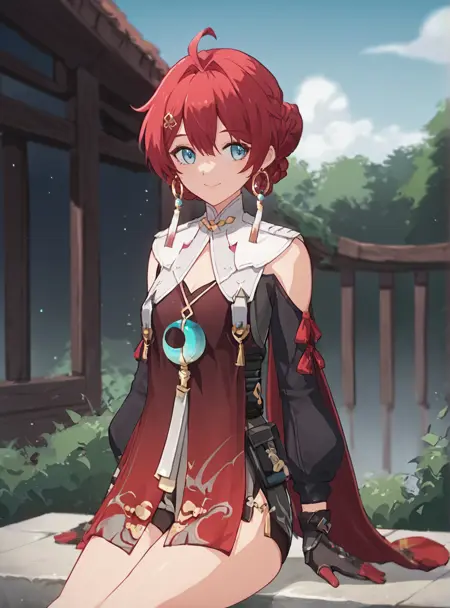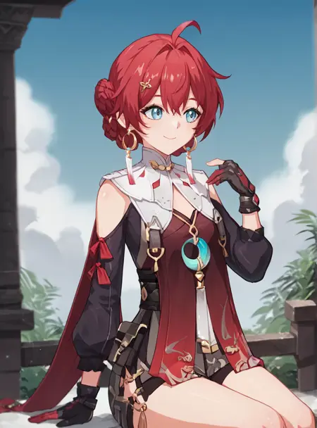 Prompts: solo, 1girl, red hair, gloves, smile, earrings, jewelry, bangs, hair bun, ahoge, hair ornament, braid