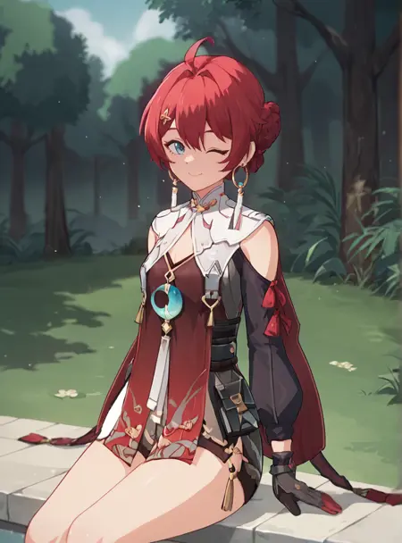提示词:solo, 1girl, 红发, 手套, 微笑, 耳环, 饰品, 刘海, 发髻, ahoge, 发饰, 辫子