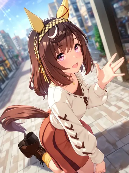 • 말 귀, 말 꼬리, 미소, 넥타이, 흰색 셔츠, 미니스커트, 흰색 손가락 없는 장갑, 갈색 재킷, 하이힐, 한쪽 허벅지 양말, 머리띠, 손가락 없는 장갑, 흰색 신발, 빨간 신발, 갈색 손가락 없는 장갑, 단축 재킷, 비대칭 하의, 허벅지 끈, 비대칭 신발, 맞지 않는 신발, 중간 길이 머리, 갈색 치마, 고밀도, 볼륨감 있는 짧은 소매, 노랑색 머리띠, 노랑색 리본, 귀 장식
