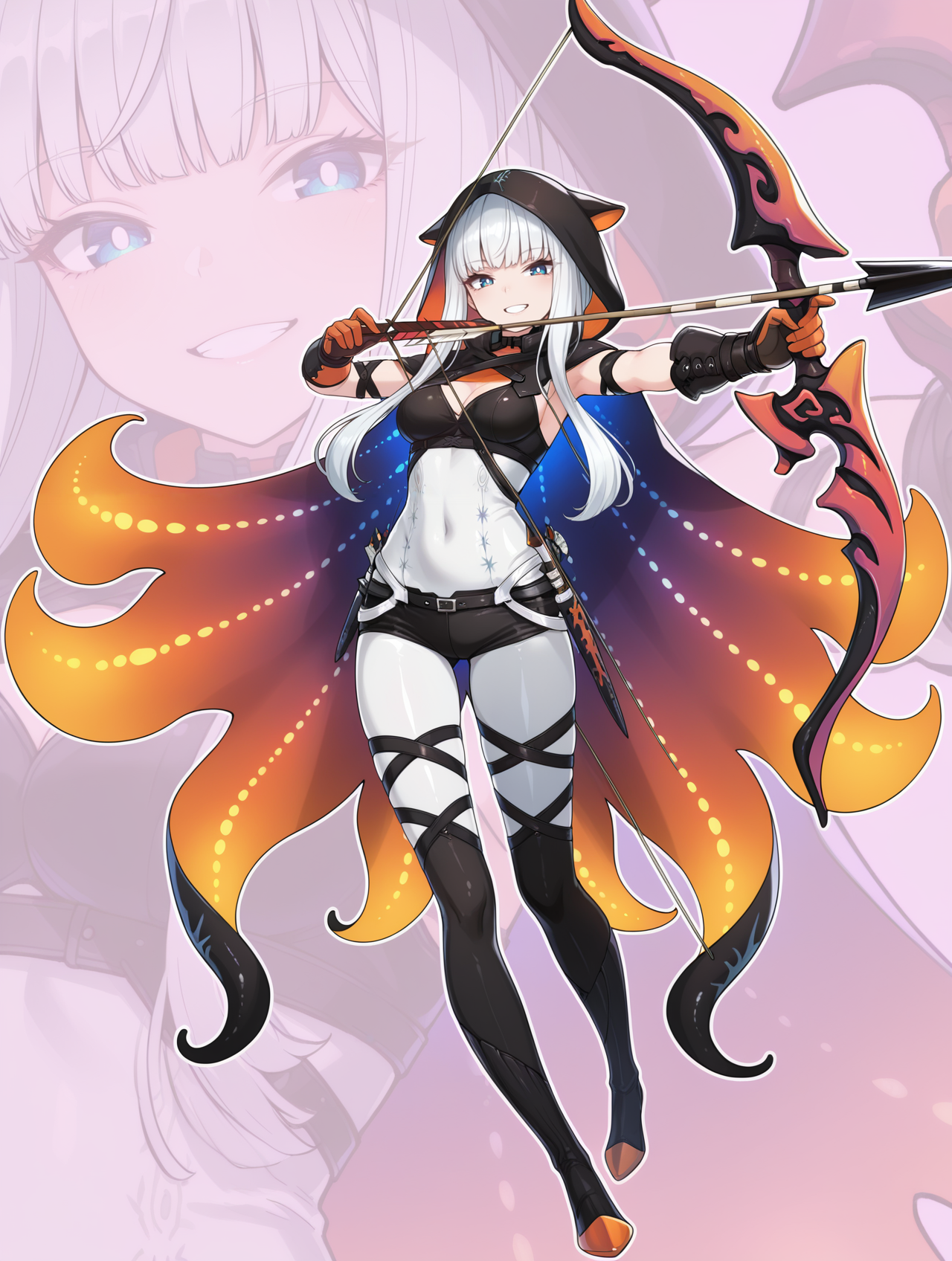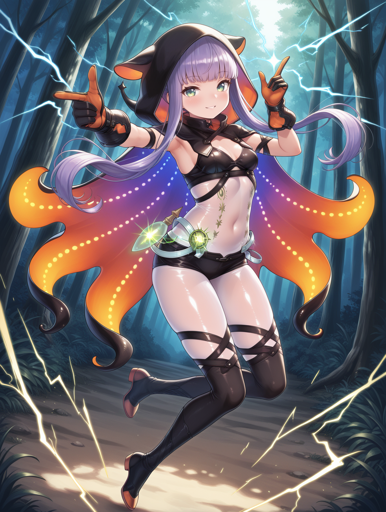 Tags (clothes, Beta armor): namielle armor, black hood, black gloves, black bodysuit, black shorts, black thigh boots, orange tentacle cape,