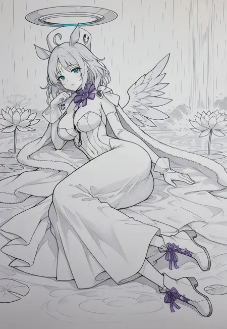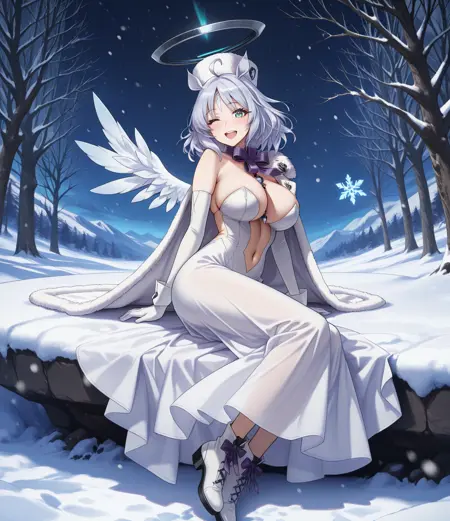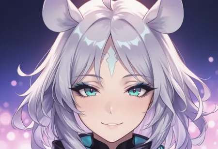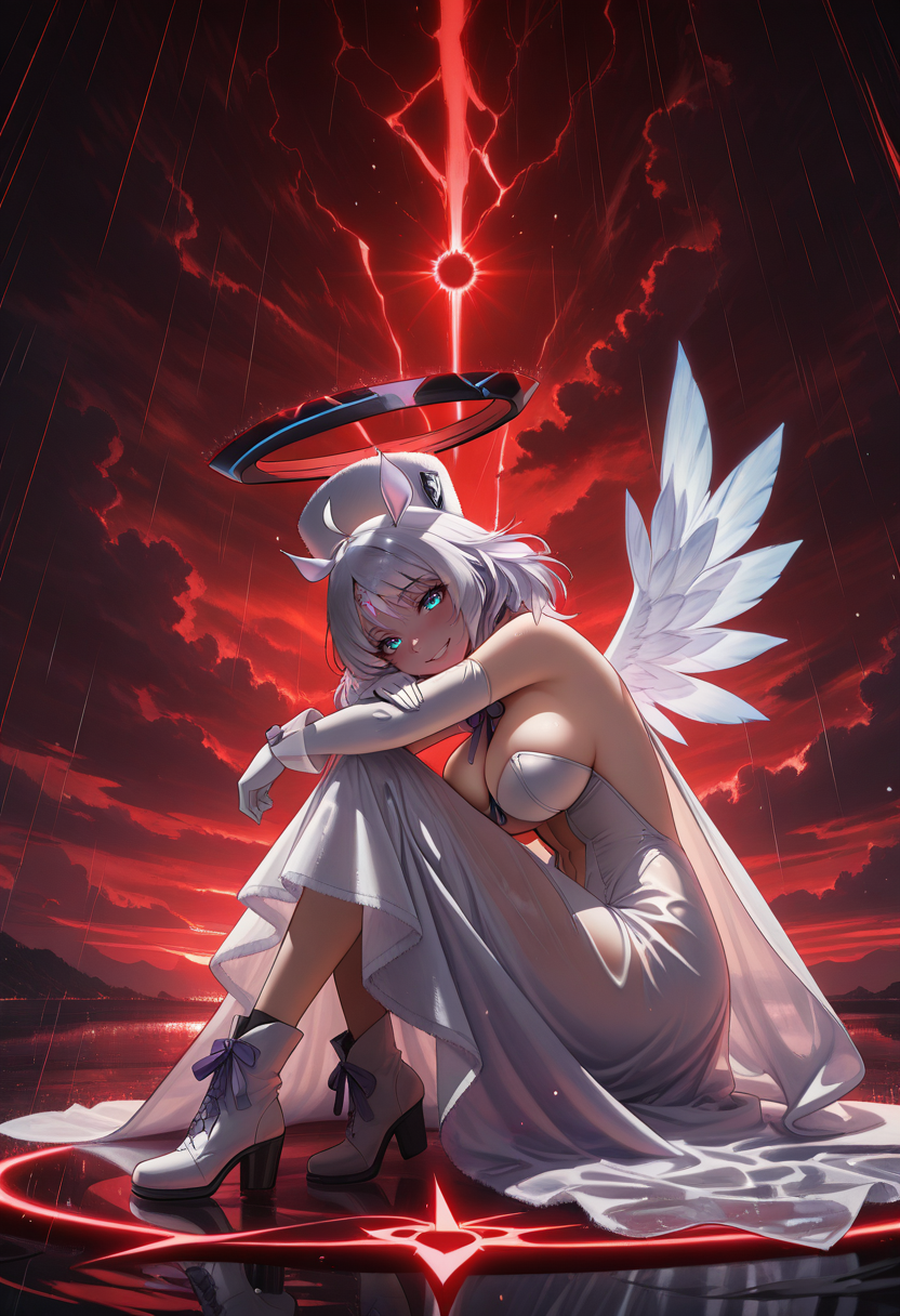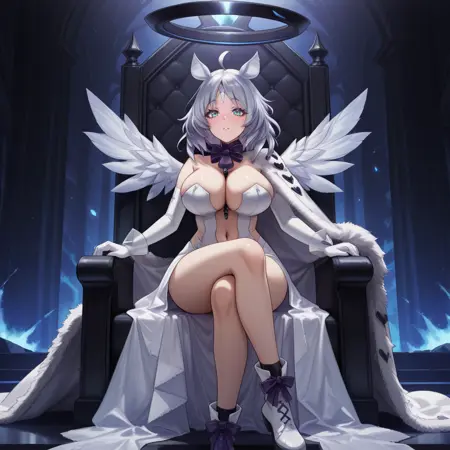 キャラクター: 白髪、短髪、額のマーク、翼、機械的ハロー、動物の耳