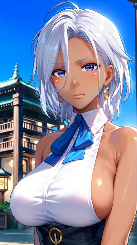 1woman, 高挑,深色古铜色皮肤,侧乳,深银色头发,深蓝色眼睛,白色连衣裙,背部敞开并有胸襟,蓝色丝带,红色长裙,蓝色长裤,浅蓝色鞋子,左臂戴一对金手镯,右腕戴蓝白相间的手镯,