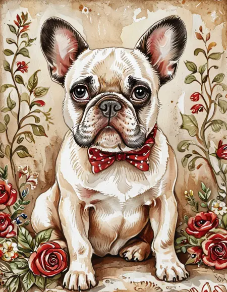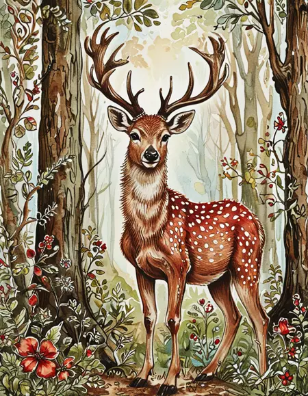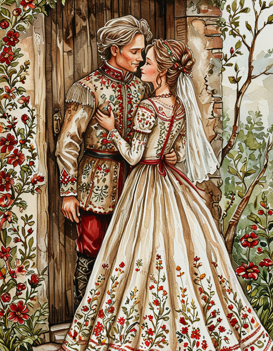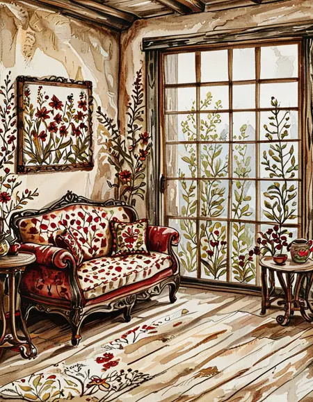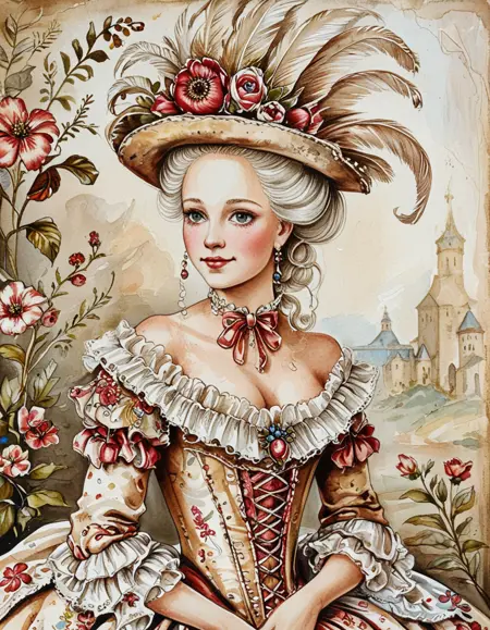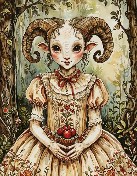 이 수채화 스타일은 잉크로 그린 윤곽선과 흙 같은 빨강, 갈색, 녹색 색조를 특징으로 합니다. 수채화 텍스처는 수채화를 요청하지 않더라도 강하게 나타납니다. 이 스타일은 캐릭터를 19세기 패션으로 묘사하는 경향이 있으며, 특히 플로럴 드레스를 선호합니다. 기본 설정은 보통 숲이나 시골 풍경을 배경으로 합니다.