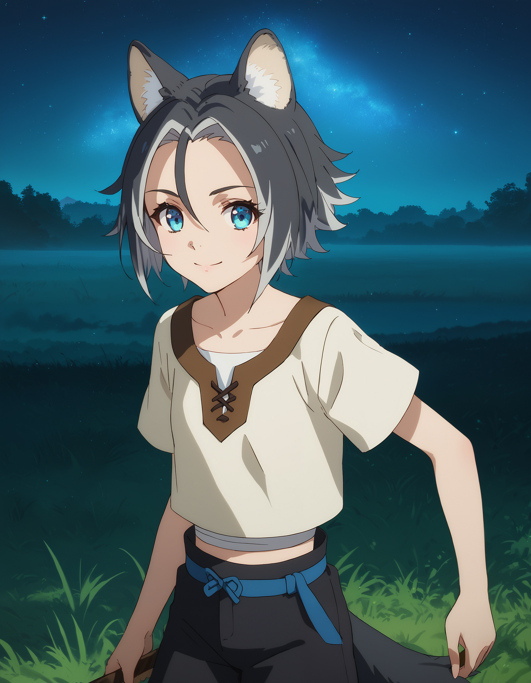 1girl, keel, blue eyes, short hair, two tone hair, gray hair, animal ears, tail, small breast,