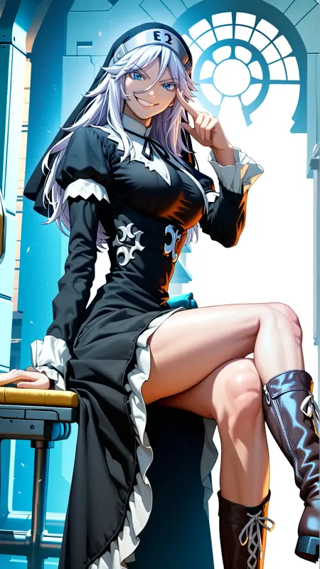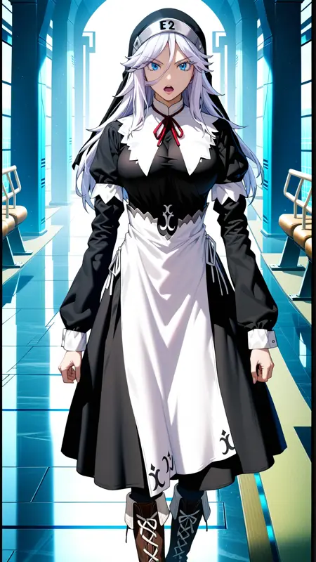 1girl, blue eyes, gray eyebrows, long white hair and eyelashes, a long-sleeved black nun's habit with "E2" on the headpiece, knee-length brown boots, mechanical seam across forehead,