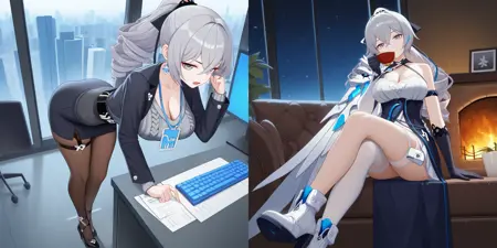 Bron, Fol006, Br_Nof, ponytail, bronya zaychik, grey hair, grey eyes, pencil skirt, alternative black skirt, alt multiple belts, different black belt, lanyard, id card, grey sweater, cleavage, knit sweater, dark brown pantyhose, alternate pantyhose, single earring, drill hair, long hair, black thigh strap, suit jacket, alternate black jacket, alternative long sleeves, alternate open jacket, alternate black sleeves,