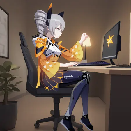 Bron, Fol003, Br_Dmb, bronya zaychik, grey hair, grey eyes, hooded dress, striped dress, gradient dress, orang stripes, alt black dress, hood down, white breastplate, wide sleeves, star (symbol), alternate long sleeves, gradient sleeves, orange sleeves, shoulder armor, alternate black bow, twin drills, different hair bow, alternative mechanical legwear, blue legwear,