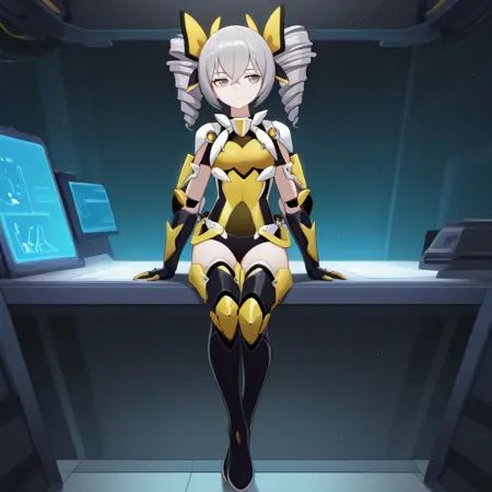 Bron, Fol002, Br_Yam, bronya zaychik, grey hair, grey eyes, armored leotard, armor, yellow leotard, clothing cutout, arm armor, thigh boots, black footwear, two-tone bow, alternate hair bow, twin drills,