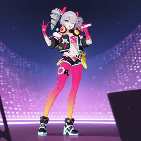 Bron, Fol003, Br_Tcb, bronya zaychik, grey hair, grey eyes, headphones around neck, collarbone, magenta tube top, magenta shoulder straps, magenta pantyhose, gradient pantyhose, alternative pantyhose, navel, micro shorts, alt black shorts, white trim, front zipper, alt open jacket, puffer jacket, alt cropped jacket, alt detached sleeves, puffy short sleeves, black sleeves, single fingless gloves, magenta gloves, single arm warmer, asymmetrical gloves,