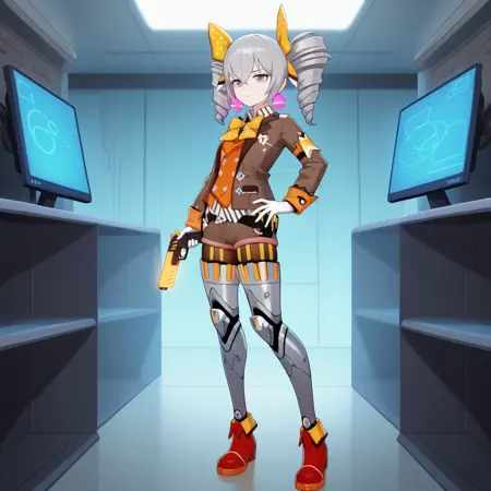 Bron, Fol003, Br_Wod, bronya zaychik, grey hair, grey eyes, brown jacket, orange wrist cuffs, white gloves, alternate gloves, collared jacket, polka dot bow, alt collared shirt, alt white shirt, alt striped shirt, orange vest, vest, black belt, alt short shorts, brown shorts, alternate mechanical legwear, brown pantyhose, alternate pantyhose, big bow, alt yellow bow, polka dot, alternative hair bow, side drill, purple earrings,
