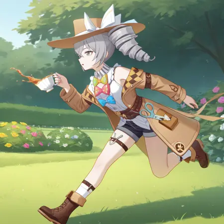 Bron, Fol003, Br_Mht, bronya zaychik, grey hair, grey eyes, multiple bowties, multicolored bows, sleeveless shirt, buttoned shirt, alternate white shirt, alternate short shorts, off-shoulder coat, brown coat, open coat, bare shoulders, gorget, scissors, thigh strap, multiple belts, alt brown belt, buckle, hat, brown headwear, side drill,