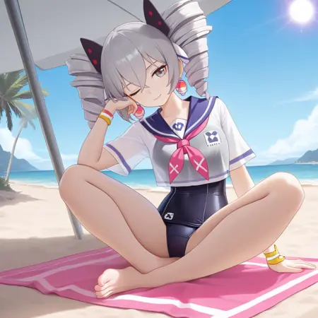 Bron, Fol001, Br_Swm, bronya zaychik, grey hair, grey eyes, twin drills, hair ornament, cropped shirt, sailor shirt, white shirt, pink earrings, dark blue sailor collar, pink neckerchief, school swimsuit, alt short sleeves, white sleeves, black one-piece swimsuit, swimsuit under clothes, bracelet,