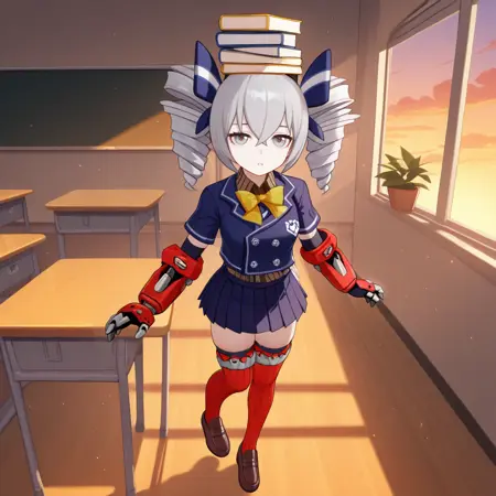 Bron, Fol001, Br_Def, bronya zaychik, grey hair, grey eyes, twin drills, striped bow, dark blue bow, hair bow, dark blue jacket, cropped jacket, collared shirt, striped shirt, brown shirt, short sleeves, dark blue sleeves, elbow gloves, black gloves, mechanical gauntlets, ribbed thighhighs, red thighhighs, mechanical legwear, pleated skirt, dark blue skirt,