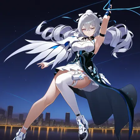 BronyaSW, Bsw_Def, bronya zaychik, Bronya Zaychik (Silverwing: N-Ex), grey hair, drill hair, grey eyes, pink pupils, hair ornament, cross earrings, side cape, white cape, single pauldron, single detached sleeve, white sleeves, white pauldron, single bare shoulder, sleeveless dress, dark blue dress, halterneck, jewelry, pleated skirt, white skirt, white bustier, asymmetrical skirt, dark blue corset, long skirt, open skirt, thigh pouch, flower-trimmed dress, single thighhigh, black ribbon, hair ribbon, white thighhighs, single arm warmer, white arm warmers, single elbow glove, black gloves, glove cutout, arm strap, white footwear,