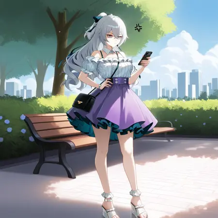 BronyaSW, Bsw_Anv, bronya zaychik, grey hair, drill hair, grey eyes, pink pupils, off-shoulder shirt, frilled shirt, white shirt, bra strap, detached collar, collared collar, wristwatch, high-waist skirt, purple skirt, frilled skirt, white short sleeves, puffy short sleeves, striped shirt, black bow, hair bow, shoulder bag, black bag, frilled ankle strap, platform sandals, white sandals, toeless footwear,