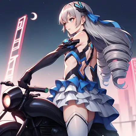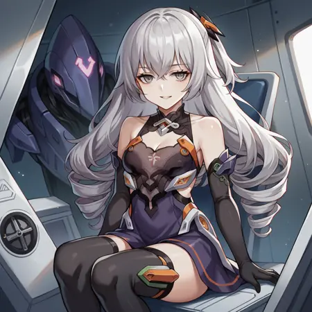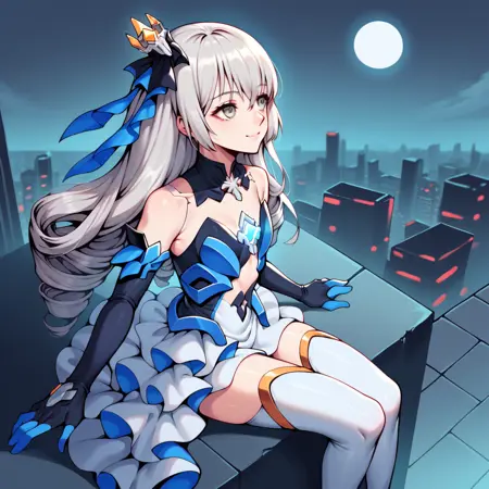 Bron, Fol006, Br_Htr, bronya zaychik, grey hair, grey eyes, starry sky hair, drill ponytail, streaked hair, long hair, colored inner hair, grey hair, halo, tiara, armored dress, armored collar, alternate detached collar, light blue dress, mechanical gauntlets, armored skirt, light blue skirt, different black skirt, alternate pleated skirt, side cutout, arm armor, alternate thighhighs, alt white thighhighs, alternate clothing cutout, bare shoulders, two-tone chestplate, white chestplate,