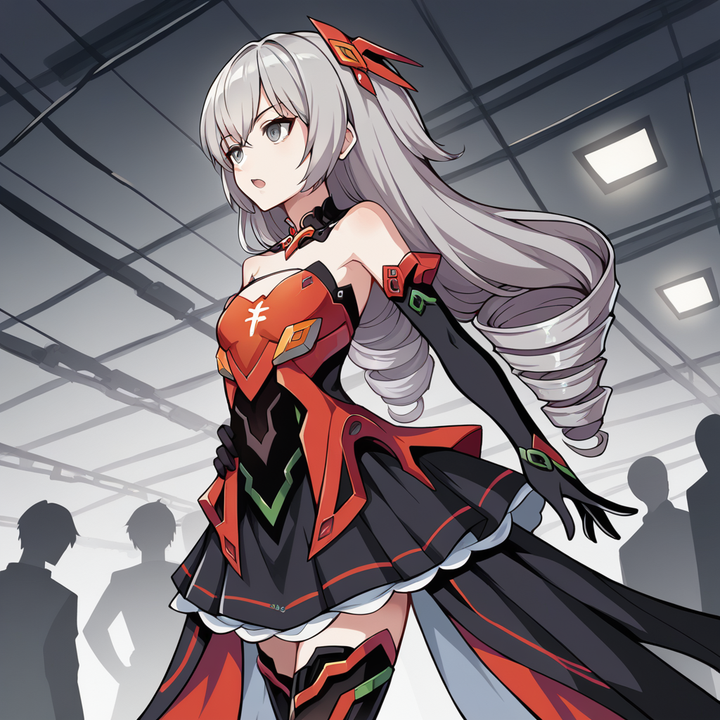 Bron, Fol002, Br_Drk, bronya zaychik, grey hair, grey eyes, alt white dress, twin drills, pleated dress, detached collar, black trim, black ribbon, ribbon, chest strap, detached sleeves, alternate short sleeves, alt white sleeves, wrist guards, alt gloves, alternate black gloves, thighhighs, red thighhighs, headgear,