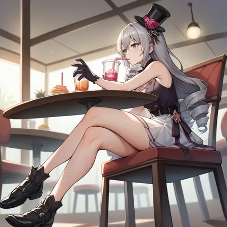 Bron, Fol003, Br_Mht, bronya zaychik, grey hair, grey eyes, multiple bowties, multicolored bows, sleeveless shirt, buttoned shirt, alternate white shirt, alternate short shorts, off-shoulder coat, brown coat, open coat, bare shoulders, gorget, scissors, thigh strap, multiple belts, alt brown belt, buckle, hat, brown headwear, side drill,