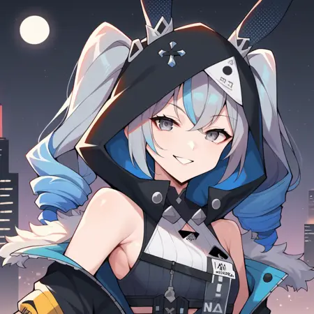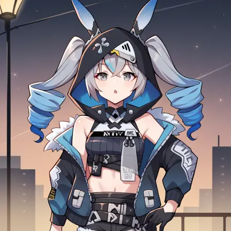 Hax_Def, 줄무늬 머리, 파란 머리, 토끼 헤드, 토끼 귀, 헤드 씌움, 검은 자켓, 열린 자켓, 털 장식 자켓, 털 장식, 파란 내부 자켓, 어깨 노출, 소매 없는 셔츠, 검은 셔츠, 흰 셔츠, 검은 벨트, 복부 노출, 크롭탑, 짧은 반바지, 검은 반바지, 검은 장갑, 긴 소매,