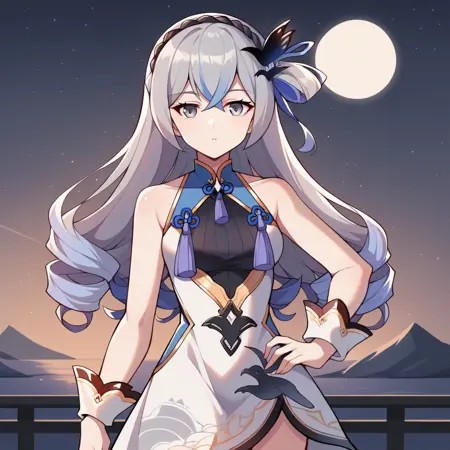 Bron, Fol005, Br_CN, bronya zaychik, grey hair, grey eyes, china dress, alt halter dress, tassel, alternate white dress, tassel earrings, white wrist cuffs, other black gloves, different gloves, cloud print, bird tattoo, leg tattoo, light blue top, blue rope, bird hair ornament, long hair, drill hair, side drill, alt black trim,