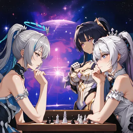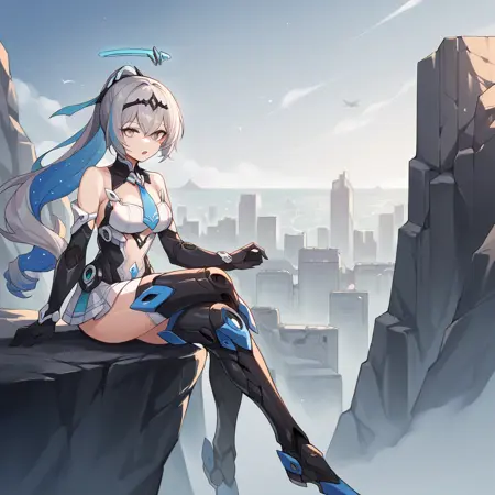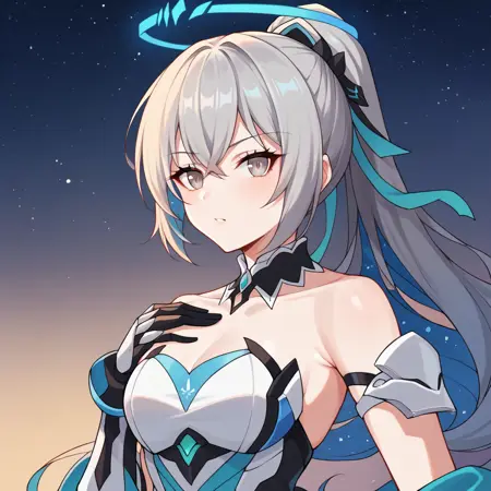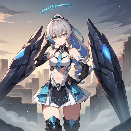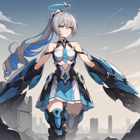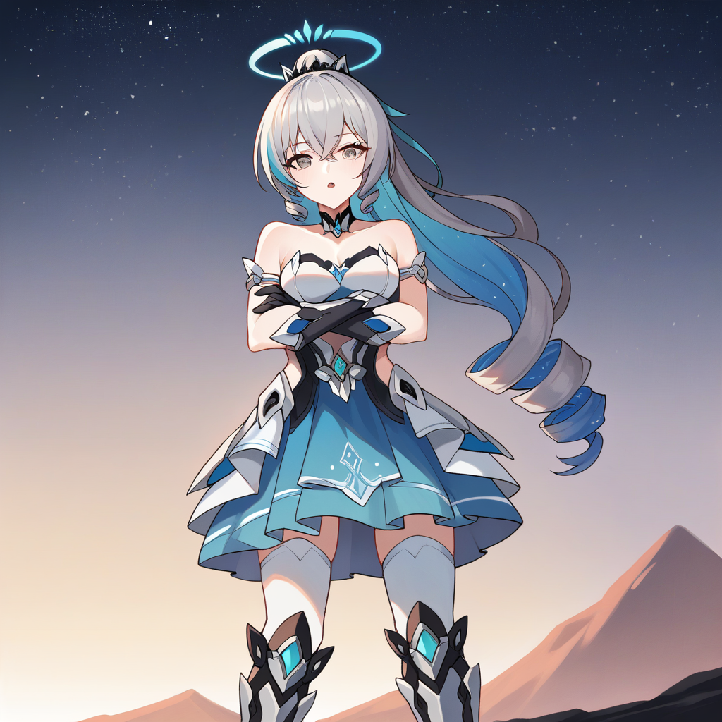 Bron, Fol006, Br_Htr, bronya zaychik, grey hair, grey eyes, starry sky hair, drill ponytail, streaked hair, long hair, colored inner hair, grey hair, halo, tiara, armored dress, armored collar, alternate detached collar, light blue dress, mechanical gauntlets, armored skirt, light blue skirt, different black skirt, alternate pleated skirt, side cutout, arm armor, alternate thighhighs, alt white thighhighs, alternate clothing cutout, bare shoulders, two-tone chestplate, white chestplate,
