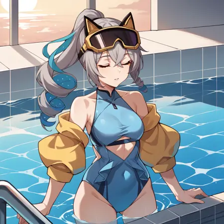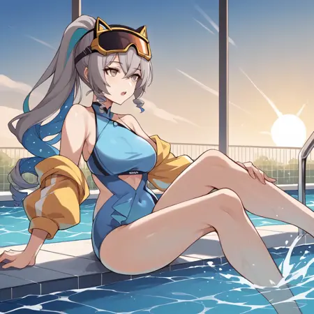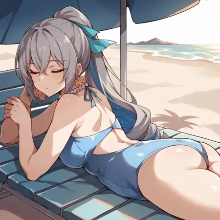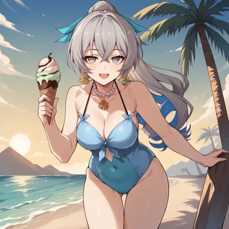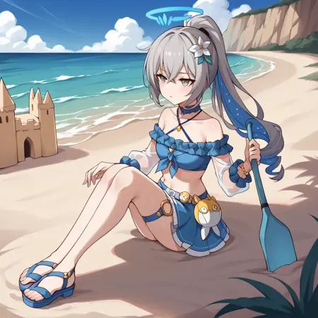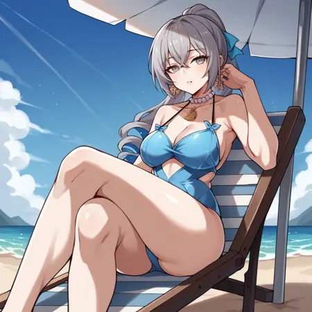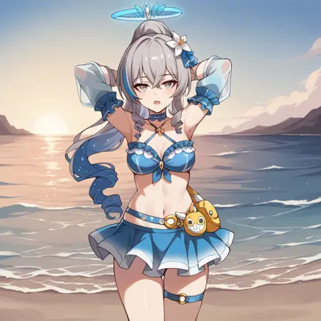 Bron, Fol006, Br_Hsw, bronya zaychik, grey hair, grey eyes, alternative detached sleeves, puffy long sleeves, see-through sleeves, light blue sleeves, alt frilled sleeves, yellow bracelet, alternate jewelry, starry sky hair, drill ponytail, long hair, colored inner hair, grey hair, streaked hair, halo, hair flower, blue bikini, frilled bikini, alt criss-cross halter, loose belt, blue belt, blue ribbon, bikini skirt, white panty straps, two-tone bikini, white bikini, drill sidelocks, frilled choker, blue thigh strap, yellow pouch,