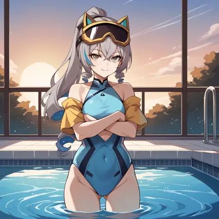 Hotr_Swm02, 运动泳衣, 蓝色连体泳衣, 眼镜戴在头上, 潜水呼吸管, 裸露肩膀, 短袖, 黄色袖子,