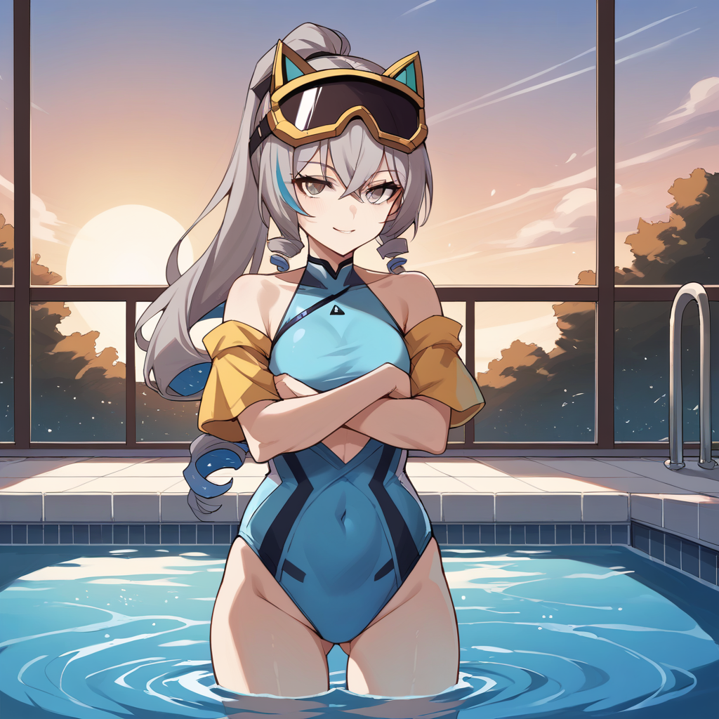 Bron, Fol001, Br_Swm, bronya zaychik, grey hair, grey eyes, twin drills, hair ornament, cropped shirt, sailor shirt, white shirt, pink earrings, dark blue sailor collar, pink neckerchief, school swimsuit, alt short sleeves, white sleeves, black one-piece swimsuit, swimsuit under clothes, bracelet,