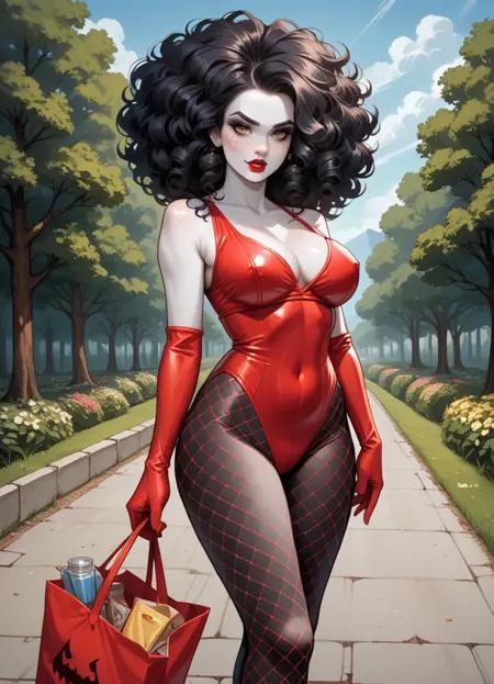 关键词:hud_sedusa、1girl、单独、大乳房、黑色卷曲长发、渔网袜、连裤袜、红色紧身衣、无袖、肘部手套、妆容、口红、白皙皮肤