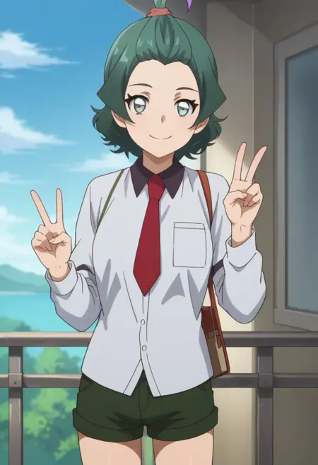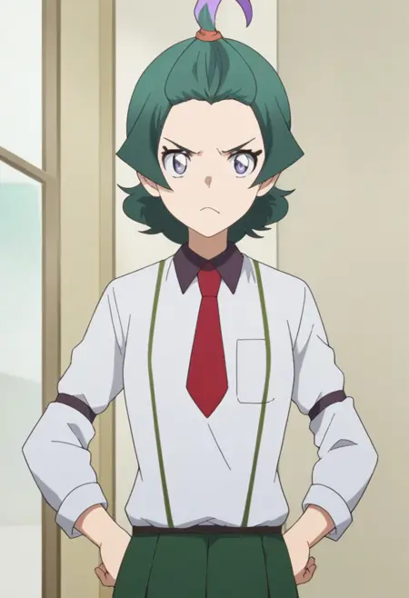 ayu, 1girl, shorts, green shorts, green hair, necktie, shirt, red necktie, topknot, long sleeves, multicolored hair, grey eyes, white shirt, collared shirt, short hair, purple hair, shoes,