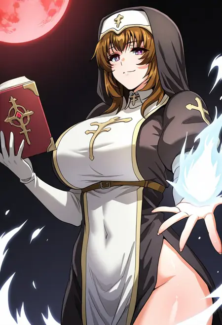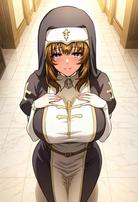 ((금색 이중 십자가 문양이 있는 짙은 회색 수녀 뱅도, 짙은 회색 수녀 덮개, 섹시한 짙은 회색 수녀 복장, 갈색 벨트, ))