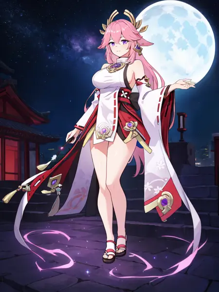 もともとのキャラクターに近づけたい場合の推奨プロンプト:1girl, (((solo))), yae_miko(genshin impact), pink hair, long hair, purple eyes, bare shoulders, full body, medium breasts, bare legs, long sleeves, white dress, curvy body, large legs, nontraditional miko, white sandals, shiny eyes, facing viewer