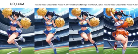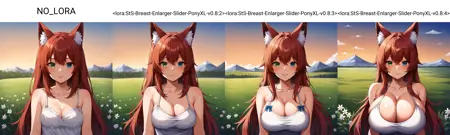 これは PonyXL 用の単極スライダーです。このスライダーの目的は、LoRA 入力値を用いて対象の胸のサイズを制御可能に増大させることです。LoRA 入力値が高いほど、胸がより大きくなります。