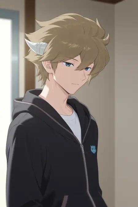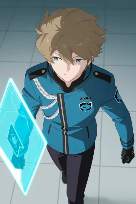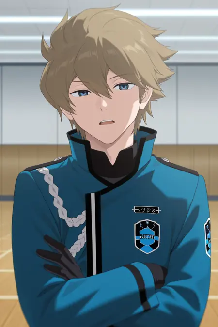 青いジャケット、黒いズボン、黒い靴、黒い手袋