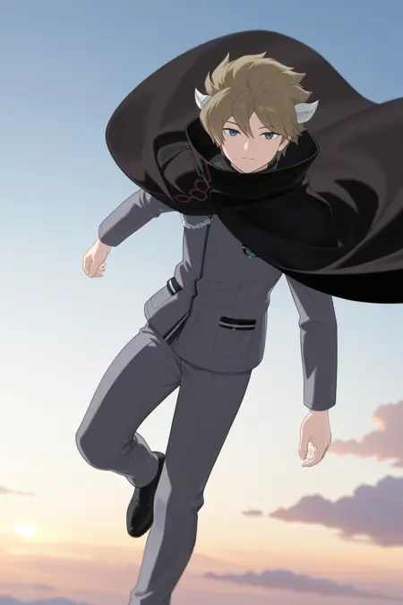 黒いマント、学ラン、グレーのジャケット、グレーのズボン、黒い靴