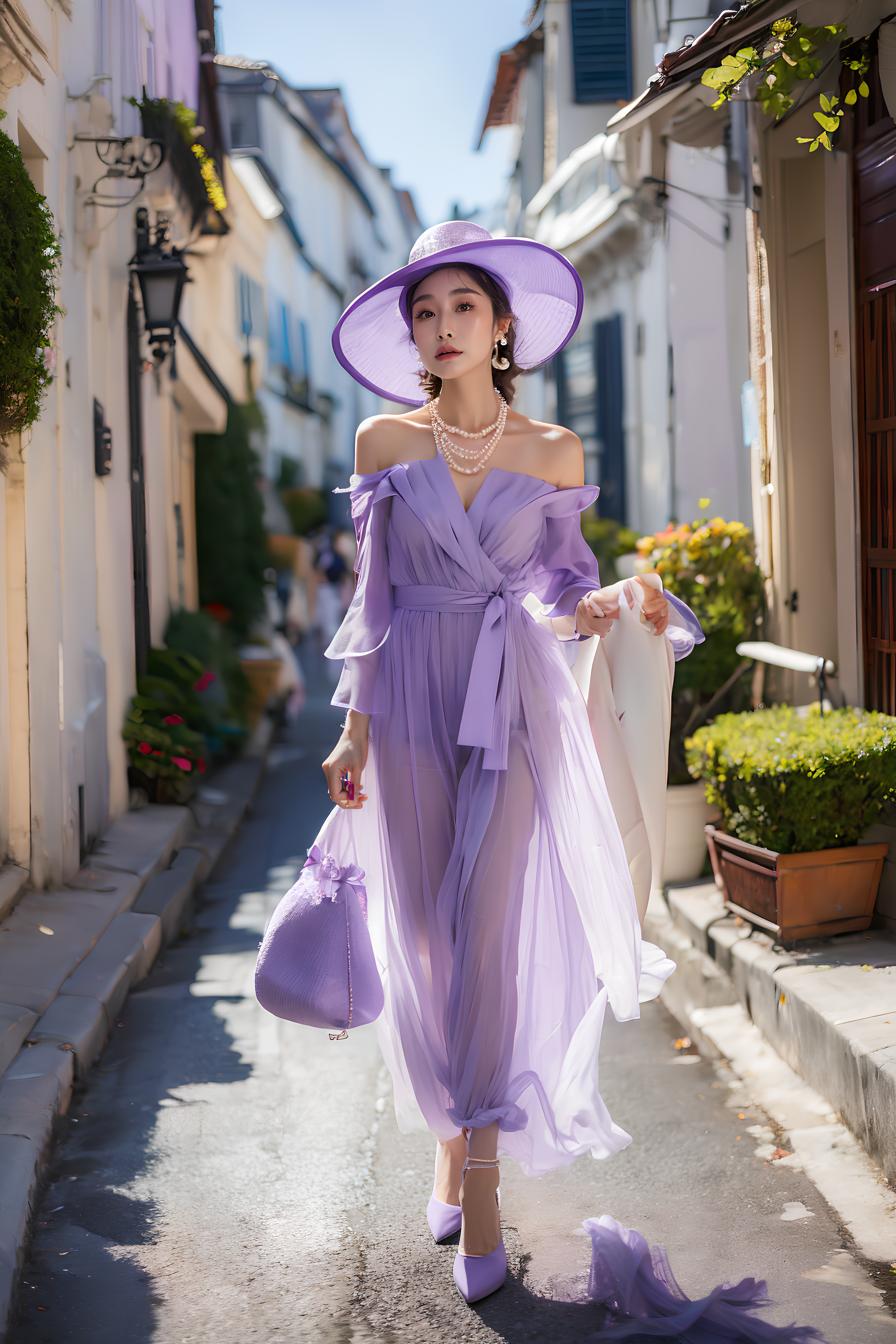 세련된 35세 베트남 여성은 몸 전체를 감싸는 연한 보라색 옷을 입고, 간단한 진주 귀걸이와 목걸이를 착용하고, 하얀 핸드백을 들고 세련된 보라색 모자를 쓴 채 프랑스의 아름다운 거리를 산책한다. 그녀의 스타일은 여름 복장의 오드리 헵번처럼 자연스러운 우아함을 발산하며, 영화적인 조명과 뛰어난 8K 디테일로 캡처되었다. <lora:lora.TA_trained 10:1>