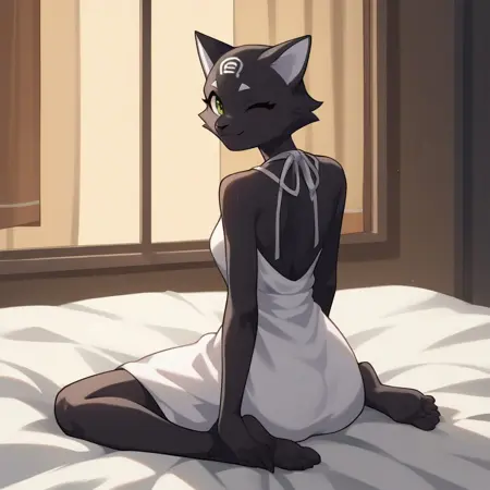 Tarahe: tarahe, black fur, feline, no tail, green eyes, forehead markings