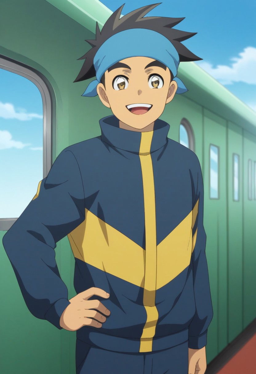 カジュアル - taiju, 1boy, male focus, headband, jacket, track jacket, track suit, black hair, blue headband, brown eyes, spiked hair, tabi,