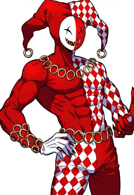 OswaldDistortion, ((6 arms, extra arms)), red bodysuit, multicolored cape, red cape, white cape, open cape