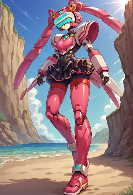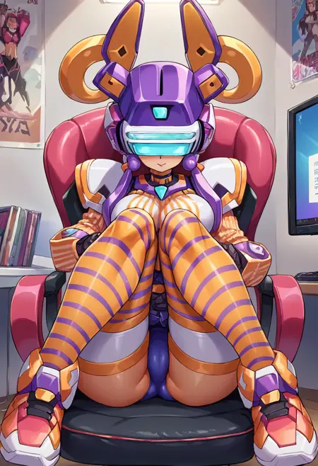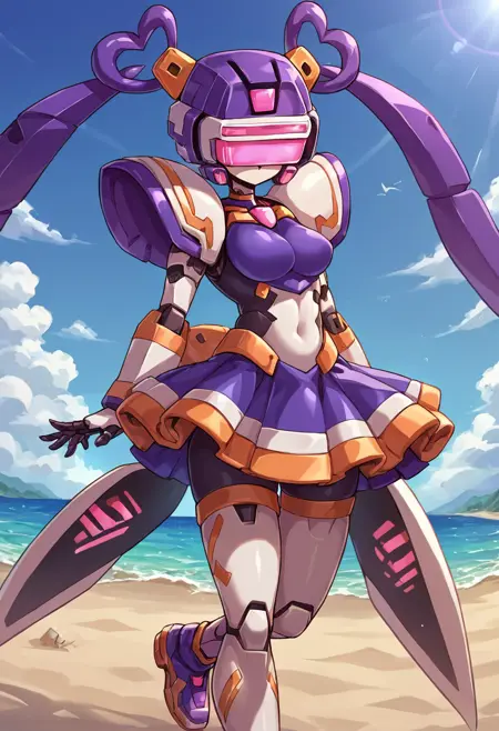 RNA-Fei-Yen, (Purple Armar:1.3), (Purple Clothes:1.3),(Purple hair:1.3), twin tails, pink eyes, (Purple Stripes thighhighs:1.3)