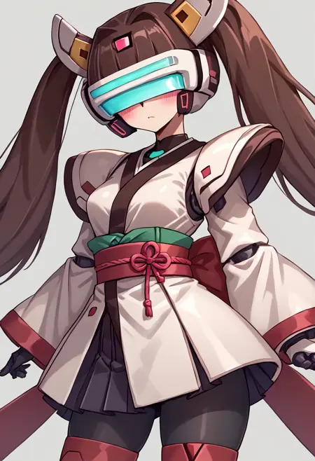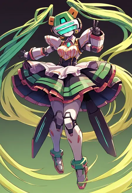 lora:Pochincoff\_VirtualOn\_V1:1,Pochincoff_VirtualOn,1 girl, robot, robot joints, armor, bodysuit, colored skin, shiny skin, head_mounted display, green eyes, thighhighs, mecha skirt, dark skin,