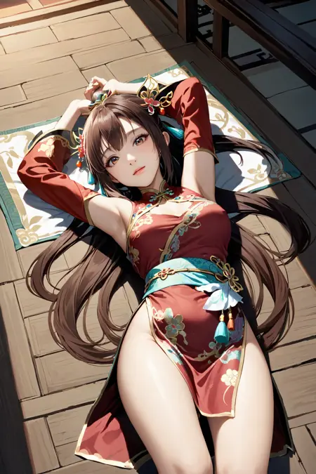 推荐正面提示:长发、发饰、裙子、中国服饰、棕色头发、花朵、珠宝
