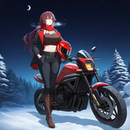 EdenHi3, Fol003, Ed_Bkr, brown hair, long hair, yellow eyes, cleavage, red scarf, brown hair, crop top, midriff, halter shirt, dark brown shirt, necklace, black pants, black belt, belt buckle, pockets, two-sided jacket, black jacket, open jacket, brown footwear, knee boots,